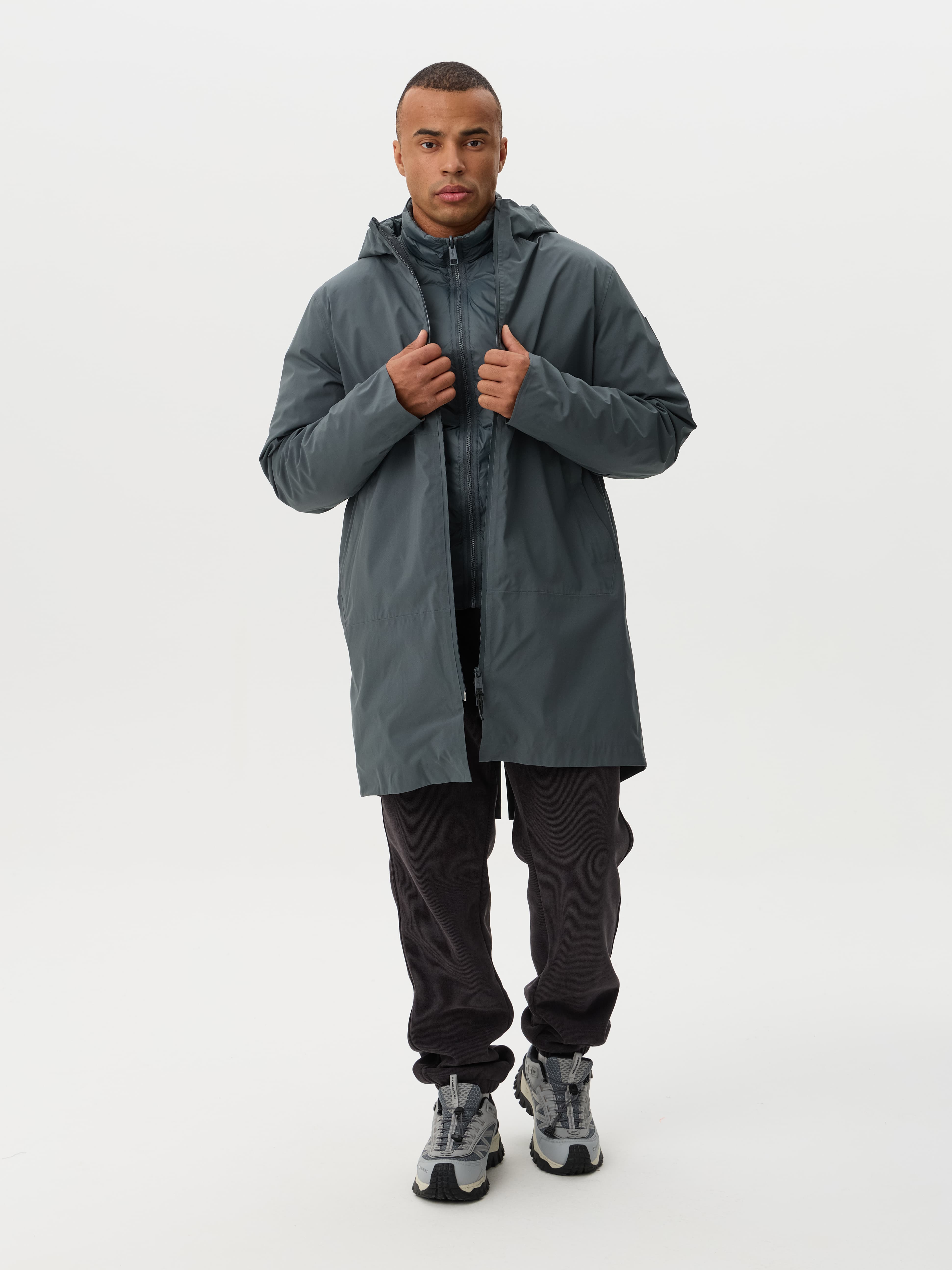 Собраны оба слоя. Удивительно, но пальто остаётся лёгким, нет ощущения «бронежилета». Манжеты регулируются, капюшон глубокий. Внутри — тепло, но не жарко даже в транспорте.